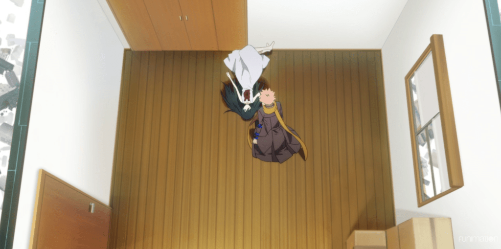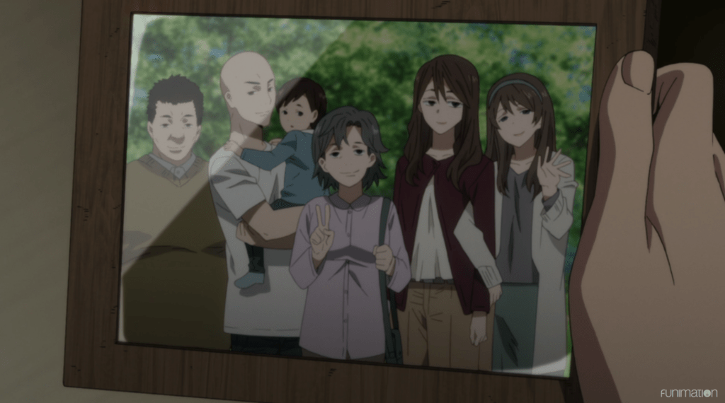Back with Sakaido, he begins putting the pieces around him and reconstructing the pieces into a house. He begins looking through the rooms from those pieces and finds an office with a picture of several people, who look like they are connected to each other.