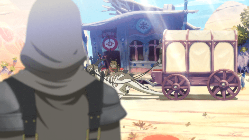 Golem and Somali are now traveling in a desert. They stop to take a break at a rest stop and get some water where they find a carriage that would easily take them out of the desert faster, but unfortunately they do not have the funds to support the taking of the carriage. Somali makes a comment that he enjoys walking with Golem no matter where it is.