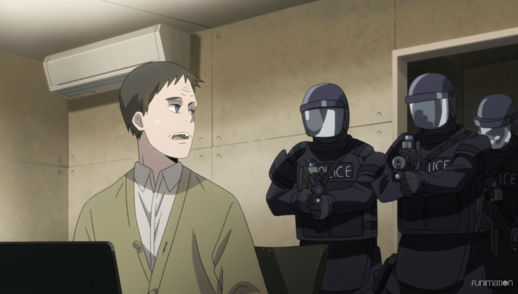 As the officers arrested the man and put him in a police unit, Hondomachi recognizes one of the on lookers in the crowd. It’s Haruka, one of the victims of the first serial killer who drilled a hole in people head.