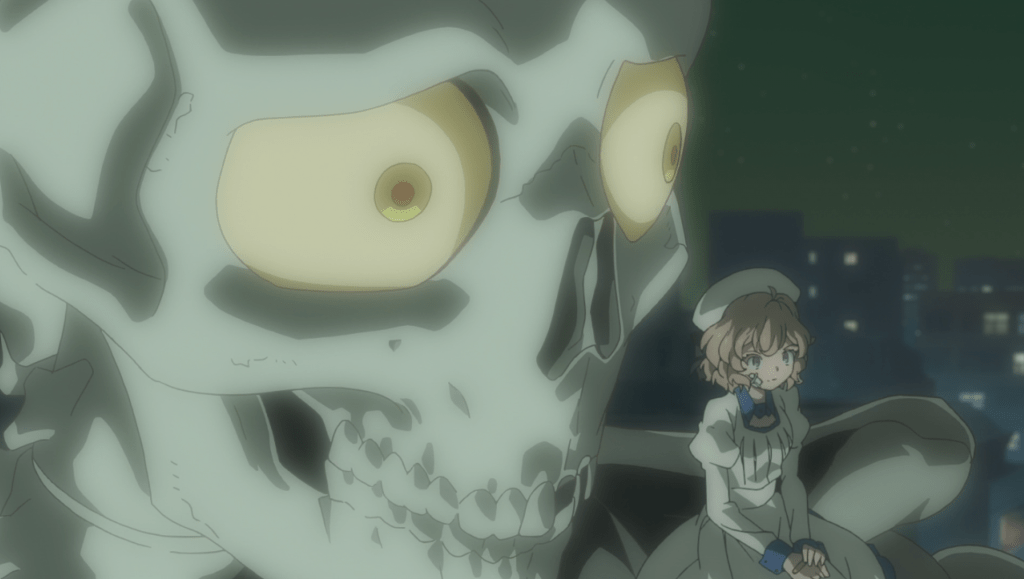 Kotoko leaves in a glorious fashion — on top of a giant skeleton yokai.