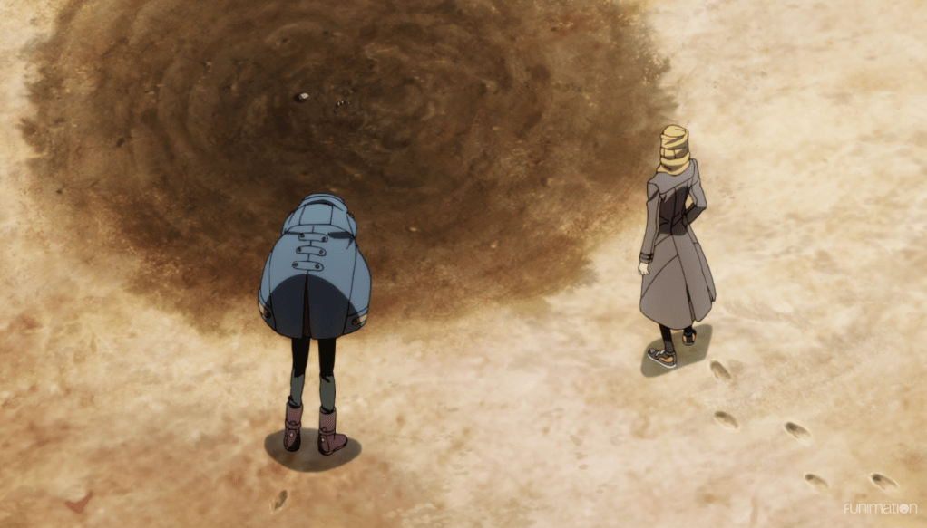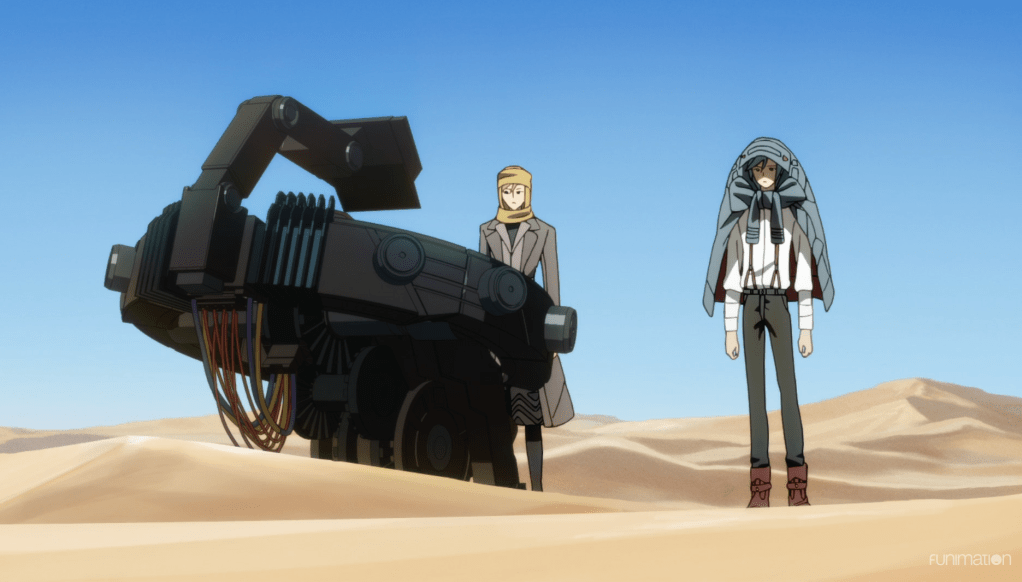 Sakaido and Anaido try to figure out what happened with Kaeru’s body, but all signs to heat exhaustion and organ failure, common ways of dying in a desert. While Sakaido continues to try investigate Kaeru’s body, Anaido ventures on following footprints that are leading away from Kaeru’s body. Eventually Sakaido catches up with Anaido, but the desert heat is getting to Anaido quickly.