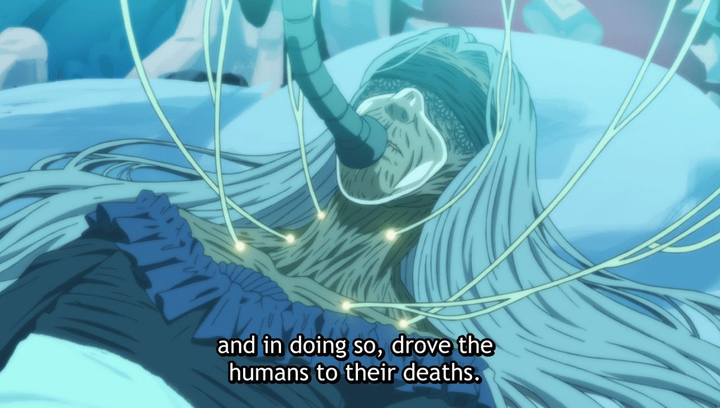 Isolde tells Golem and Somali that the humans were killed because of the story that she wrote. Feodora wished the story be told in a thousand years to give the humans and monsters time to grow accustomed to one another, but Isolde wrote the book soon after Feodora’s passing.