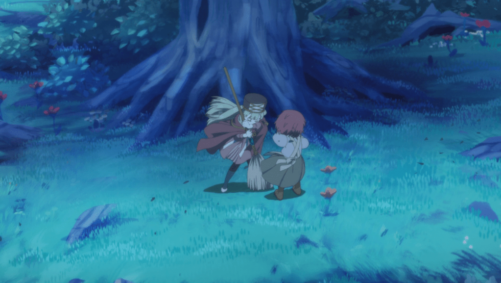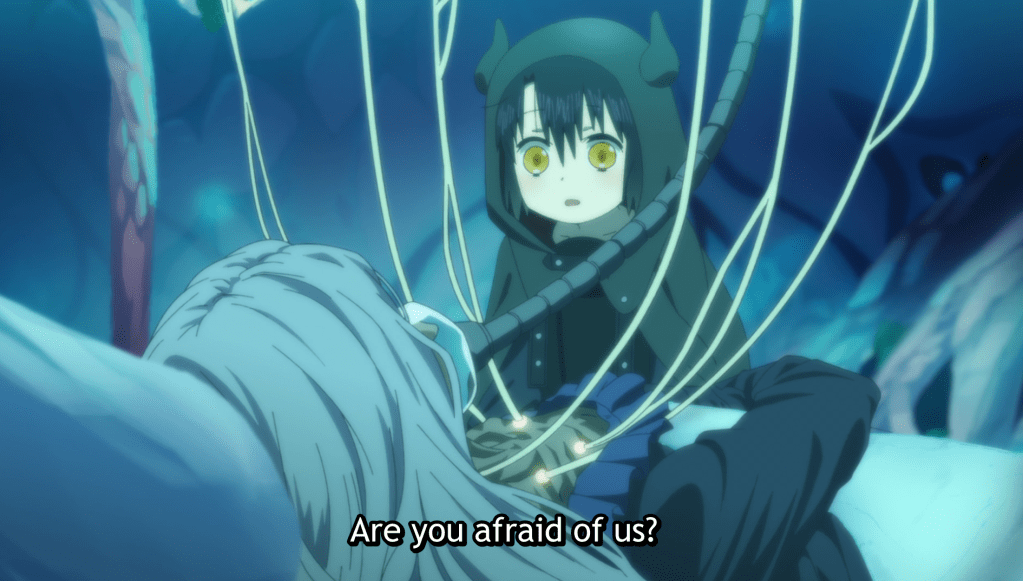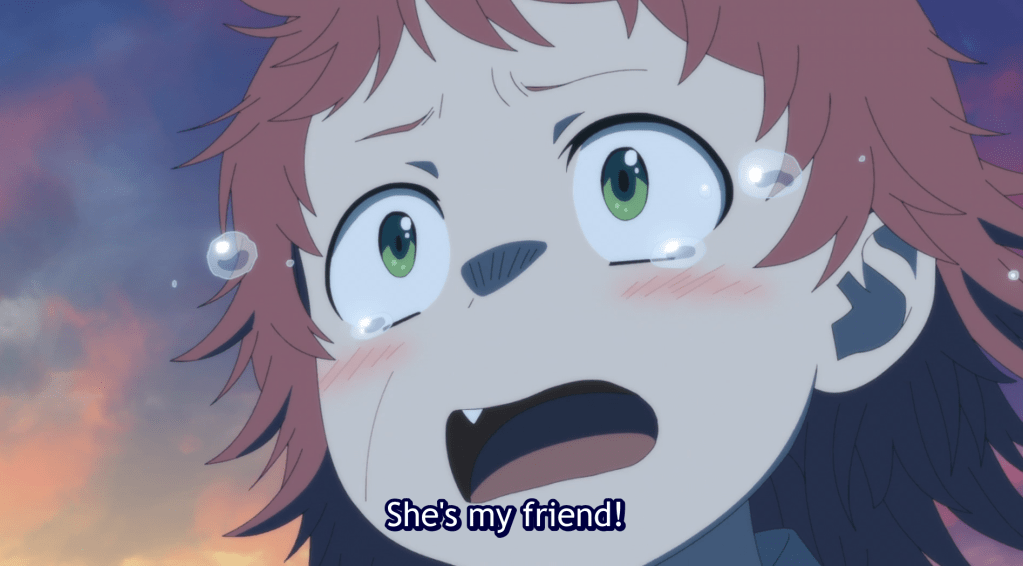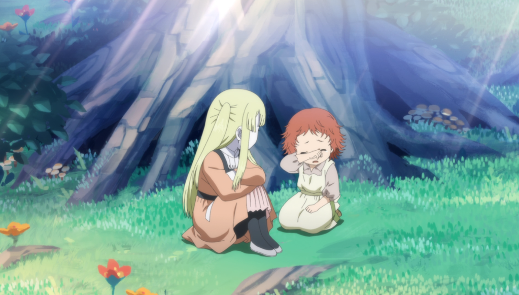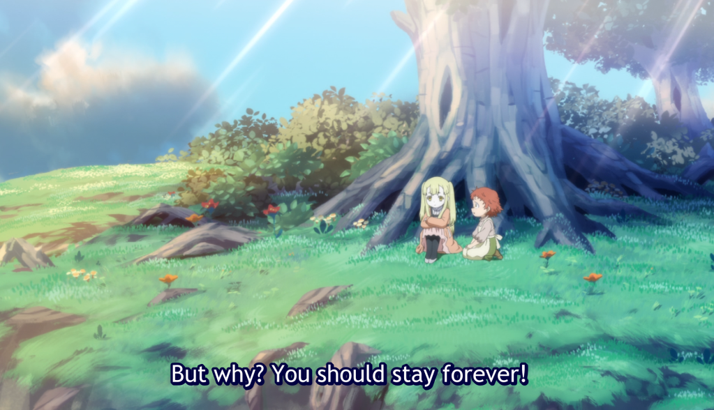 Miya finds Feodora at the tree they were at earlier in the day. Miya tries to bring her back to the village but Feodora refuses and asks Miya if she could be friends with Feodora if she was a monster. Miya tells her that it doesn’t matter because she is human, and that people cannot be friends with monsters.