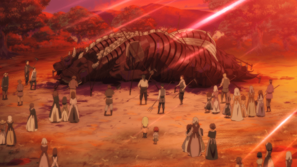Feodora and Miya go into the village to see the trouble and find that the monster has been bound and the villagers carrying pitchforks and axes.