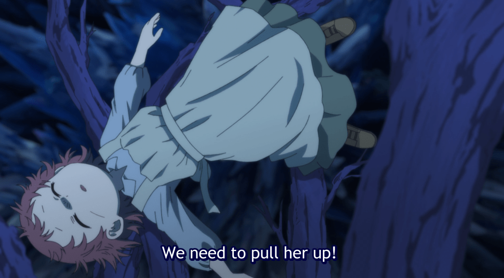 And yep, Feodora saves a falling Miya from the rocks below, the villagers are cursing at her calling her a monster and that they could kill her. Haraiso steps in and tells her that she is pardoned for saving Miya but must leave for being a monster, though Haraiso is doing this to save Feodora from the wrath of the villagers.