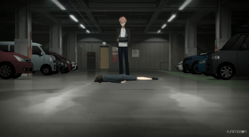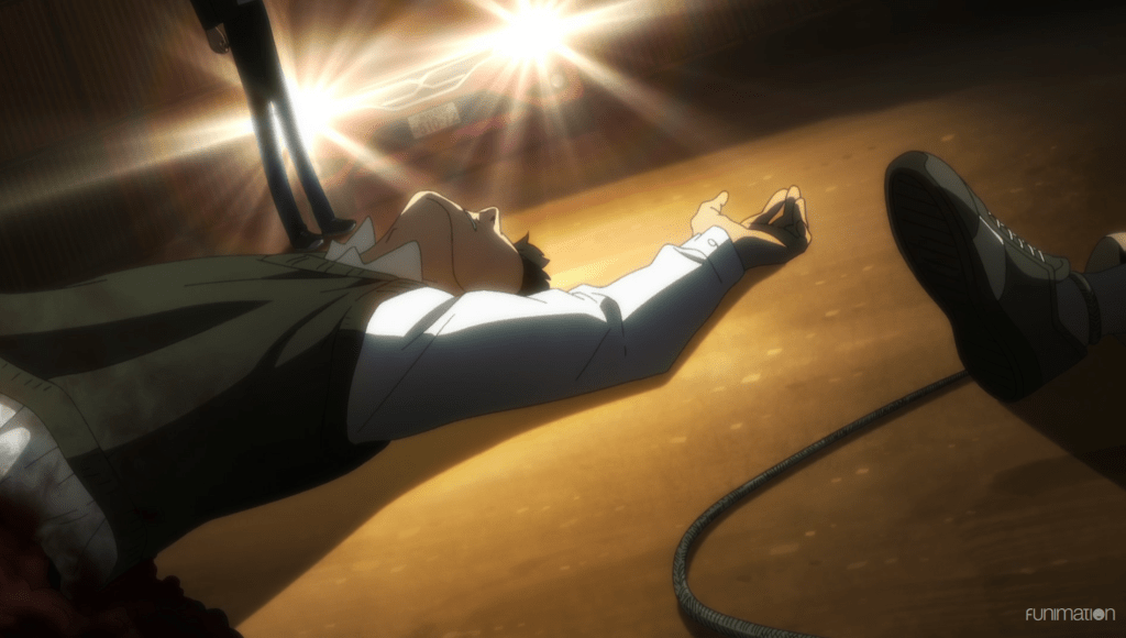 Sakaido catches up with Anaido real quick, and then things get worrisome. Anaido explains that while Sakaido was in the Id well, he had time to investigate a little. He found out who the body in the sand trap belongs to. The body is that of Akihito Narihisago.