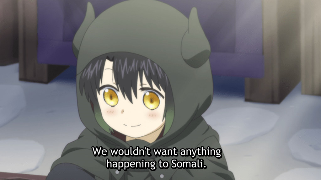 When Golem and Yabashira make it back to the cabin, Somali greets Golem and gives him the present that Somali has been working on for days, the bracelet. And to Somali’s surprise, Golem has a present for her too, a bracelet. Though Golem did not make it himself, Somali is still very happy that Golem got her a present.