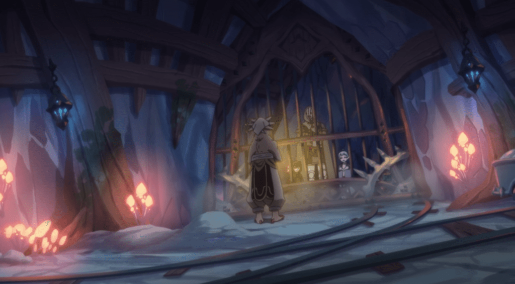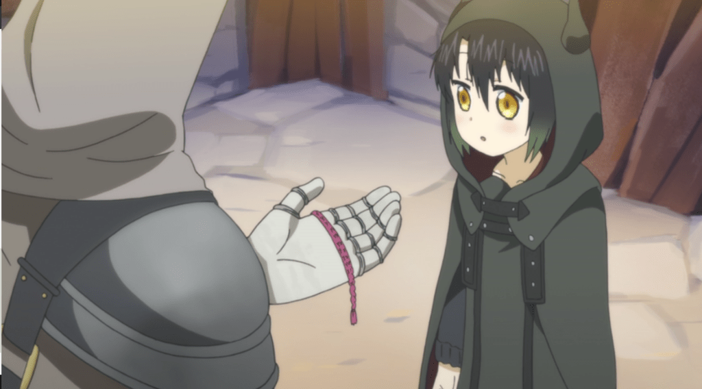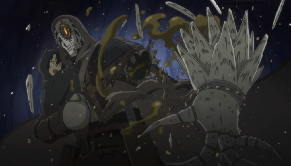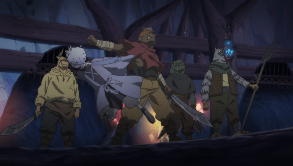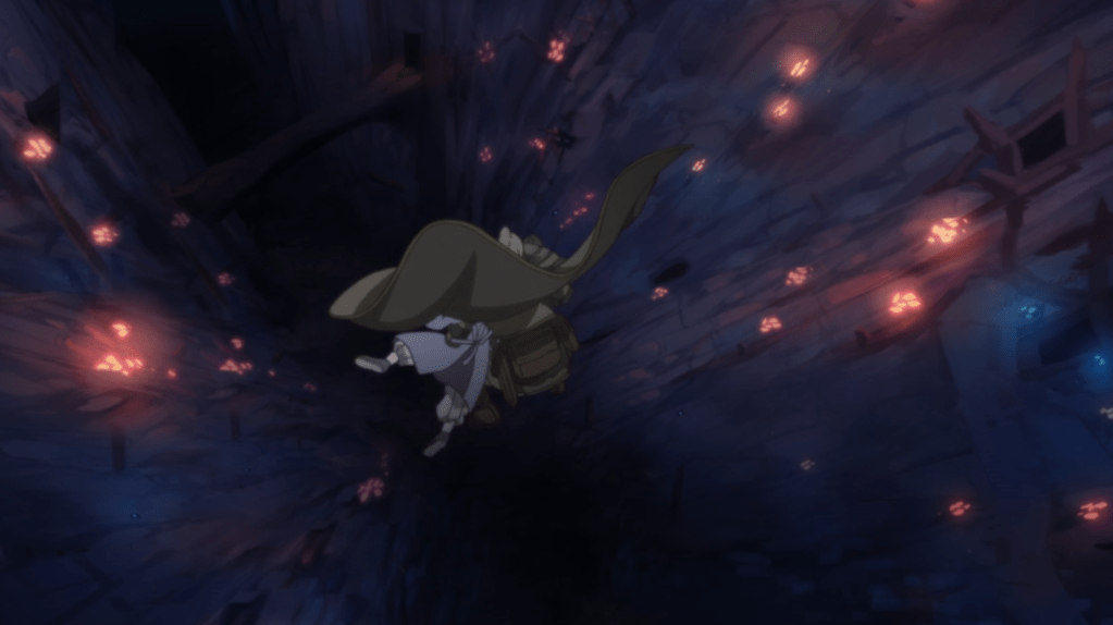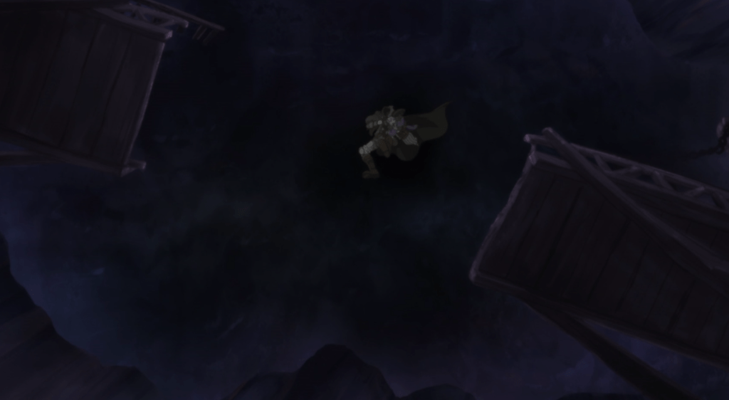 As they traverse the mine, it is not long after they are tracked down once again by hunters, different one this time, and are blocked form an escape thanks to a broken bridge in front of them. Golem does not hesitate, grabs Shizuno and Somali, and jumps down the ravine that the bridge was built to cross over.