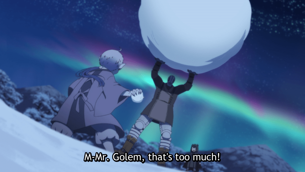 After a few minutes, Somali is in trouble by the barrage of snowballs from Shizuno. So, she tactically retreats behind Golem and asks for backup. Golem then gathers snow for a devastating attack against Shizuno.