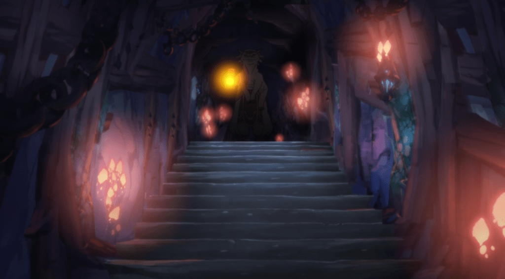 Golem prevents them from crashing at the bottom by using his armored wings to slow down their decent. Once safely at the bottom, Golem comments to himself that the creaks and cracks of his body will not stop making noise. Though he is concerned about his body, he knows that they must get to safety before more hunters catch up to them.