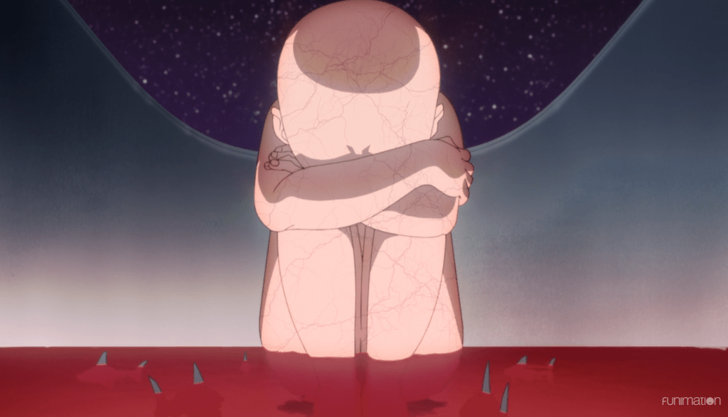 Sakaido and Hijiriido chase after Uraido through many different wells until they find him in an Id well full of red water with a giant baby-like monster in the center and sharks swimming around.